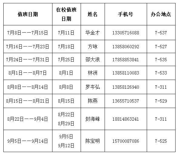 1. 7月8日至9月14日期间每周二进行在校值班,其余时间电话值班。