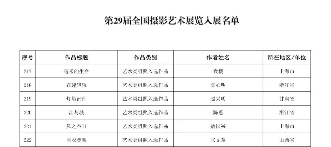 近日,第29届全国摄影艺术展览评选结果公布,我司教师陈燕摄影作品《江与城》入选此次全国摄影艺术展览。