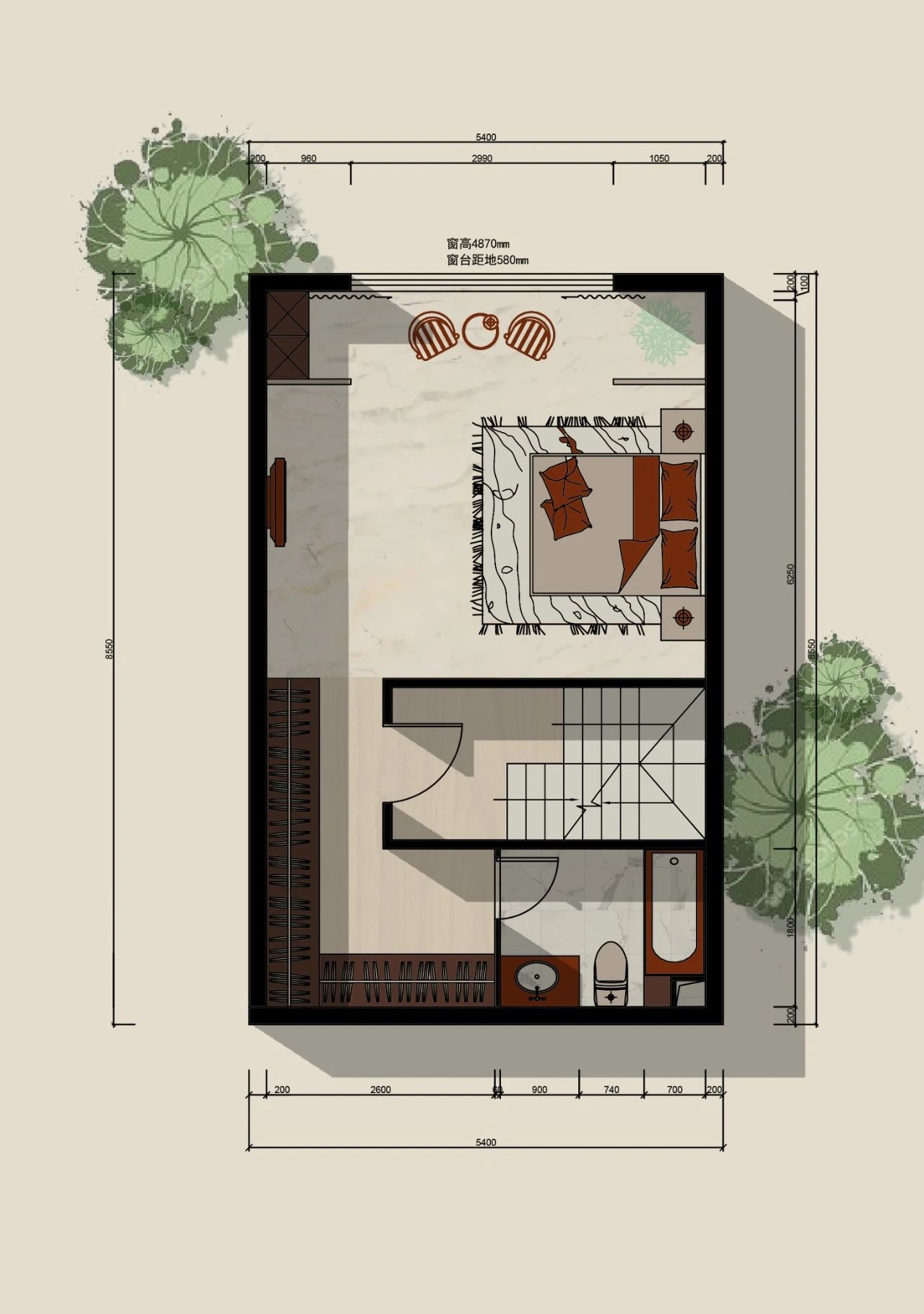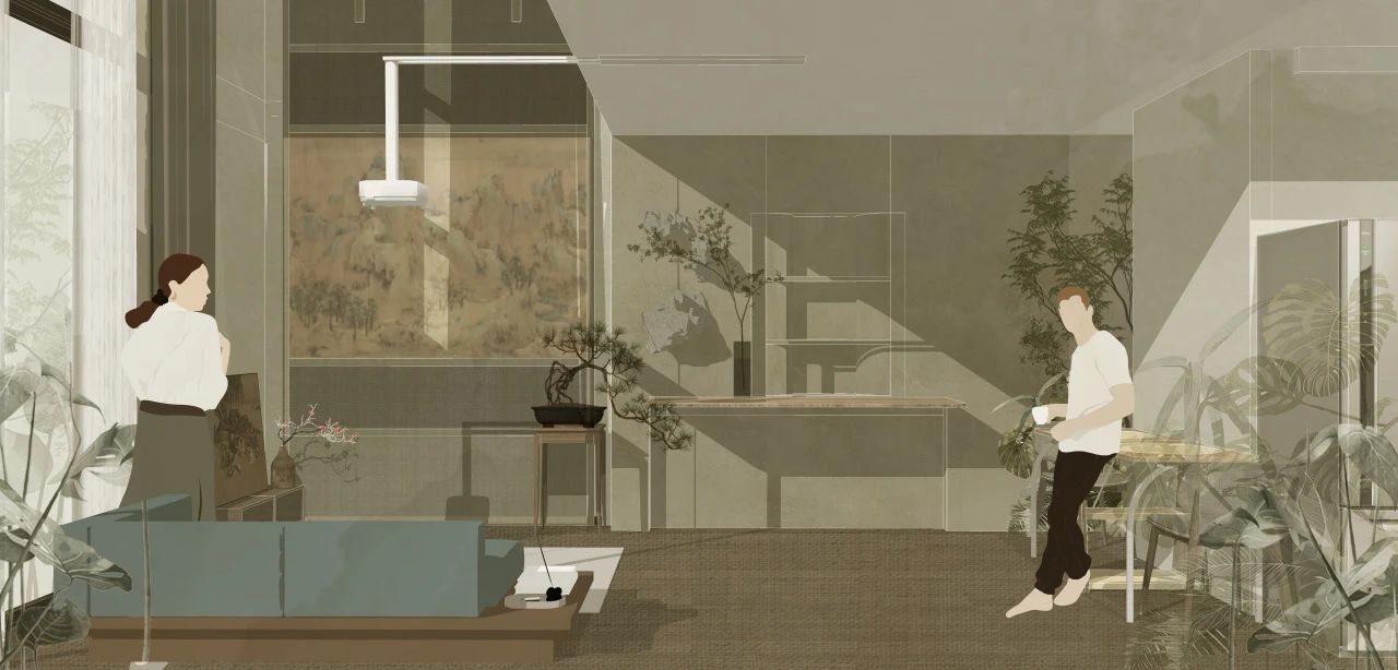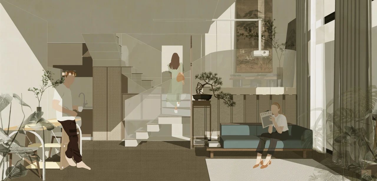 设计理念:该案以杭州钱塘区乡村振兴示范村江东村为基地,选取江东村极具代表性的花卉景观园区作为方案切入点,将花卉中心区处一幢坡屋顶建筑,改造为集可再生能源(太阳能、风能)与阳光房结合的,集盆栽鉴赏、文化长廊、商业洽谈于一体的花卉植物园展示建筑。建筑外立面为玻璃幕墙,展示区域具备阳光房的功能,内部清水混凝土实体建筑作为商业洽谈区域。方案的技术创新点:1、阳光房空调能耗源于绿色建筑设计中的太阳能光伏建筑一体化。2、团队运用净化水体的花卉实现中水循环可再生净化系统。3、中央景观楼梯设计将绿色屋顶和花卉展示合二为一。该案结合了杭州地域特色和自然景观优势,利用绿色建筑与可再生能源技术,展现了设计团队乡村建筑改造的创意和凝聚力。