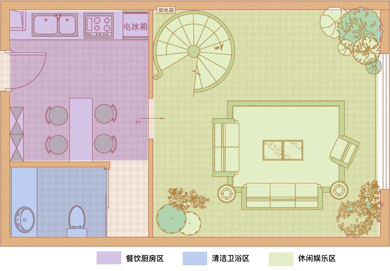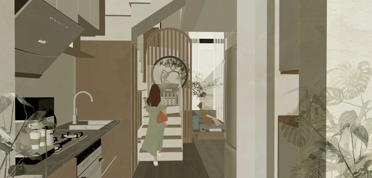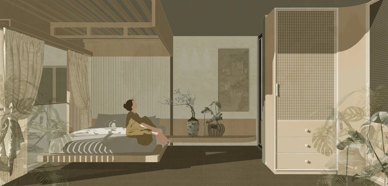 设计理念:万目攒视,见有勾萌出,渐大;俄成树,枝叶扶苏,倏而花,倏而实,硕大芳馥,累累满树。每位单身女性都是一株蓄势待发的树苗,在灯火喧嚣的城市里,树苗需要在参天大树的庇护下恣意而生。本案是一套为单身女性打造的高质量公寓空间,它即为参天大树,树屋提供满满的安全感与舒适感;树洞提供足够的收纳空间;果实提供安静的办公学习空间,让个人的内在提升永不停息;绿叶寓意自然,让居住者在钢筋水泥空间中触摸清新和自然。