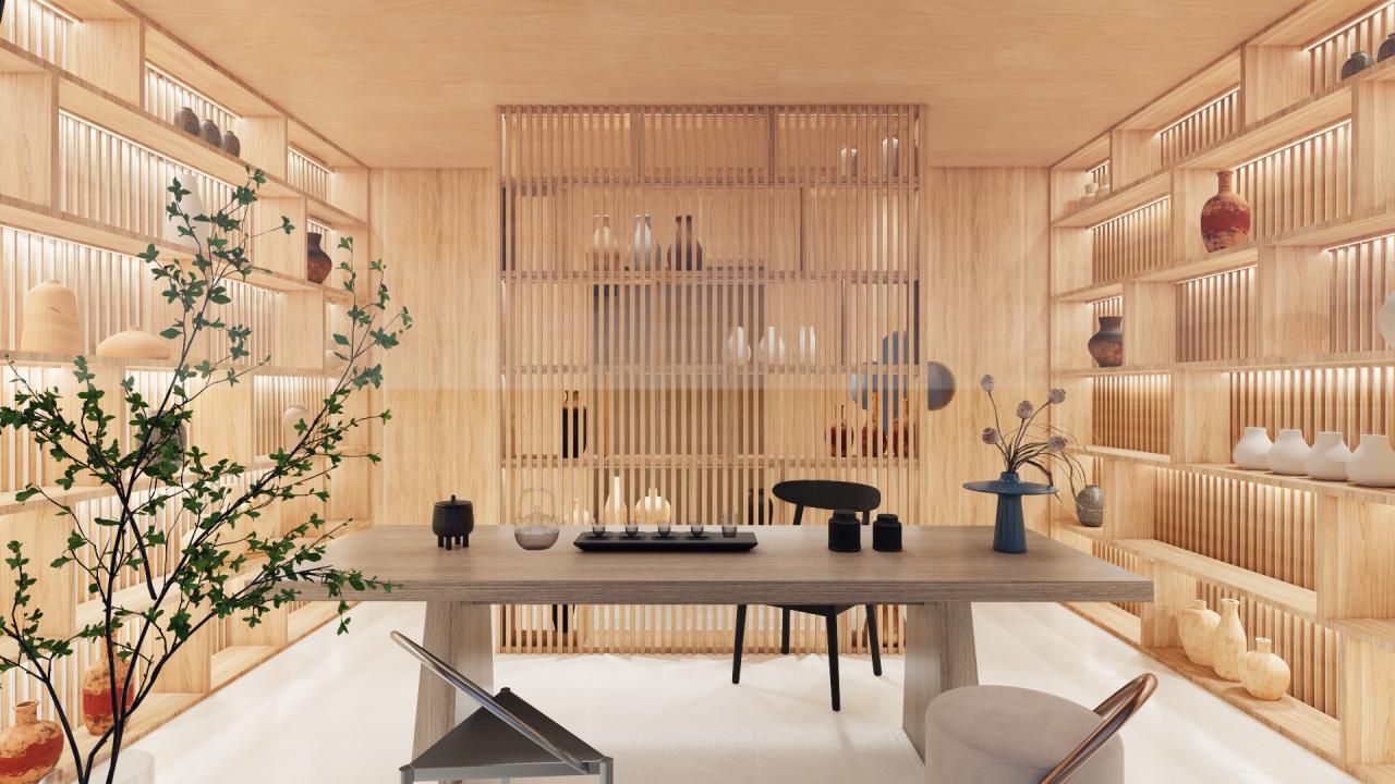 设计理念:“几榻有变,器具有式,位置有定,贵其精而便,简而裁,巧而自然也。”本案户主为一位追求生活品质并爱好陶器收藏的陶艺单身女教师,公寓空间从女教师的兴趣爱好及审美感受出发,以艺术馆为出发点,借鉴美术展览馆的处理手法,引入空间骨架塑造室内场景,将观展脉络化为空间动线,在起、承、转、合中以现代设计语言讲述空间的人文气质,梅花窗、木格栅、无主灯线性照明……整体回归静谧质朴的东方气息居住氛围。