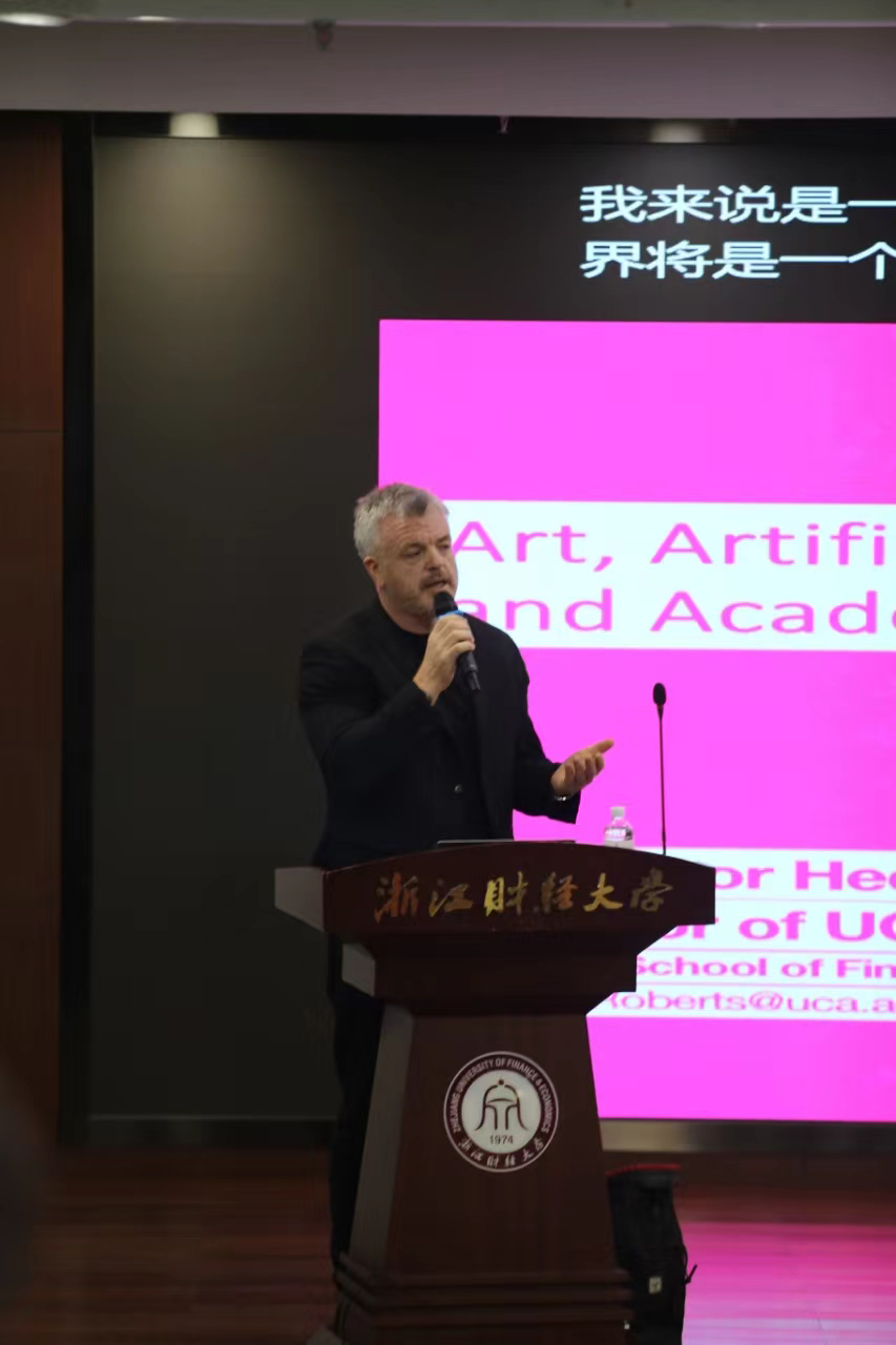 当天下午,Hedley Roberts教授在学术第四报告厅举办了以“探索艺术、人工智能与学术进步的交叉点”为主题的学术讲座。他通过对一系列经典艺术作品的分析,深入探讨了艺术的本质、艺术与媒介的关系,阐述了对艺术与当代科技发展的态度和观点,鼓励同学们消除对AI的恐慌,积极利用新技术,让艺术与生活的关系更加紧密。讲座内容充实,生动有趣,引人深思,受到了师生的一致好评。
