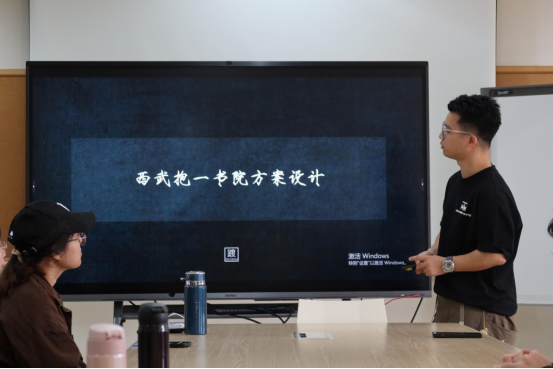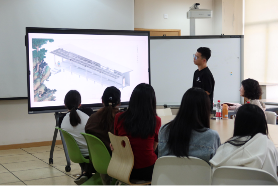 卢康强向大家介绍并讲解了自己参与的“西武抱一书院”方案设计的项目前期,通过精美的图片和生动的解说,向师生们展示了从项目前期调研到方案效果呈现的设计流程。卢康强向同学们分享了为更好的呈现设计方案所需的技能,提出在做设计方案时应抓关键词对方案进行直观精准的描述,在设计过程中应就地取材、因地制宜,要尊重当地所有的材料,促使建筑融入到当地环境中。此外,卢康强多次提出在设计中需要达到新旧结合,需保留古建筑原有的韵味,再通过现代设计书法的运用,赋予它们新的功能和运用,以及在设计的整个过程都要有以大见小的思维。