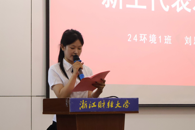 随后,24环境1班刘思洁作为新生代表发言,她表示,经过为期十四天的军训时光,无论是内在还是外表,大家都经受了阳光的洗礼,得到了意志的锤炼,她希望与全体新生一同努力,拥抱机遇,迎接挑战,乘风破浪,满心欢喜的去迎接属于自己的的老员工活。