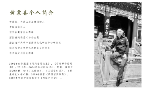 黄震喜,浙江收藏家协会古籍部分会理事、浙江省文化创意产业协会理事、杭州市青年艺术家协会会员、浙江省浦江县艺术家协会会员。现任杭州大禹山房品牌管理有限公司、杭州迪赛包装科技有限公司、杭州立华广告有限公司总经理。曾参与西泠印社复制、编写古籍20余种,如《丁丑结余》、《乐只室印谱》、《王福安印谱》等书籍,其中《乐只室印谱》等多部图书获得优秀美术图书“金牛杯”奖,连续五年带领公司团队成功申报杭州市文创项目,并获得专项资金。