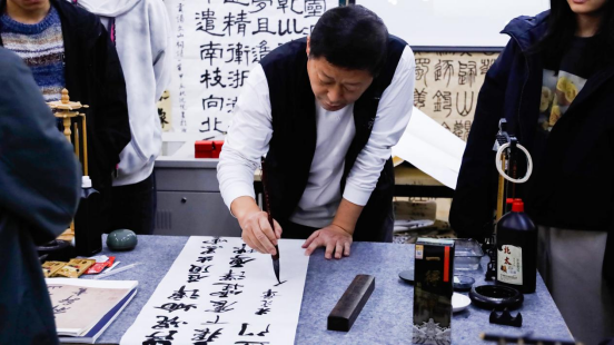况尉教授还专门到书法专业教室进行了学习辅导,通过对同学们书法习作的点评,提醒大家在临摹与创作过程中需要留心之处,并现场挥毫演示了书法如何由临摹转向创作的方式方法,从而使同学们对书法学习与创作有了更为直观和深刻的认识。